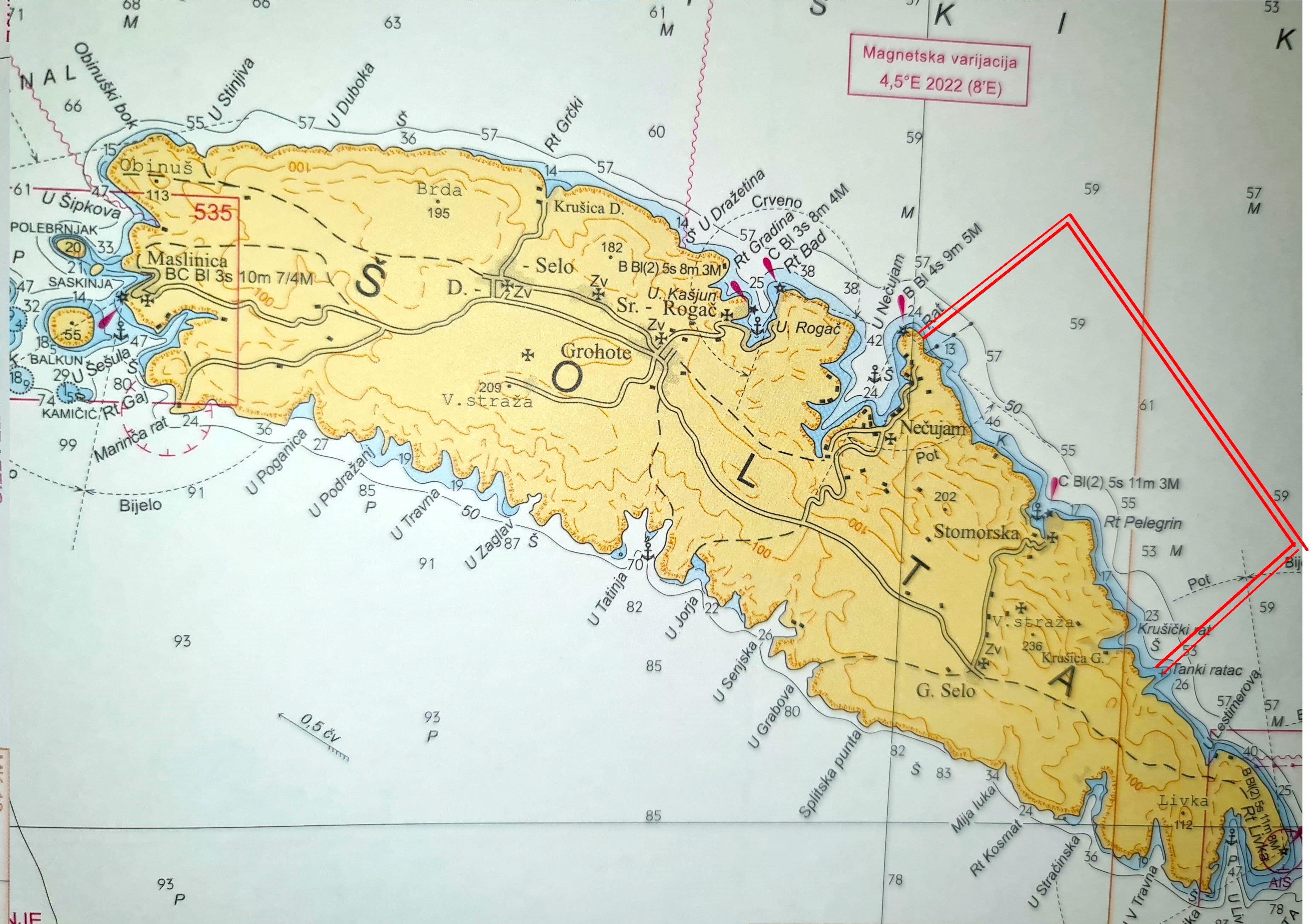 – od Rta Rat istočno od ulaza u uvalu Nečujam